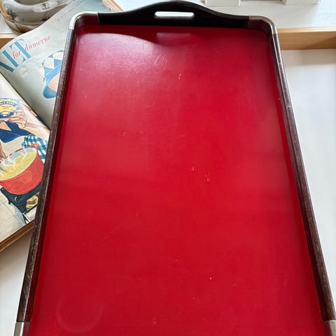 Retro trendy Serveringsbakke fra 1970, start 80’erne. Rød lakeret m/bambus el pilerør sider.