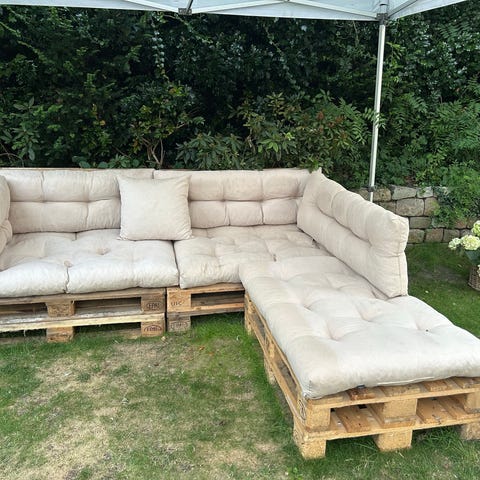 Palle-sofa med mørkegrå hynder til udendørs brug