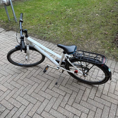 Børnecykel med 24" hjul i hvid farve. Fejler intet. Cyklen har frontkurv og bagagebærer bagtil. Udstyret med støtteben, kædeskærm og reflekser. Egnet til større børn, der passer til 24" hjulstørrelse. Brugt af min datter som nu er 8 år og den er for lille til hende nu.