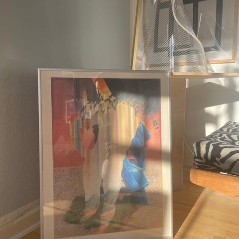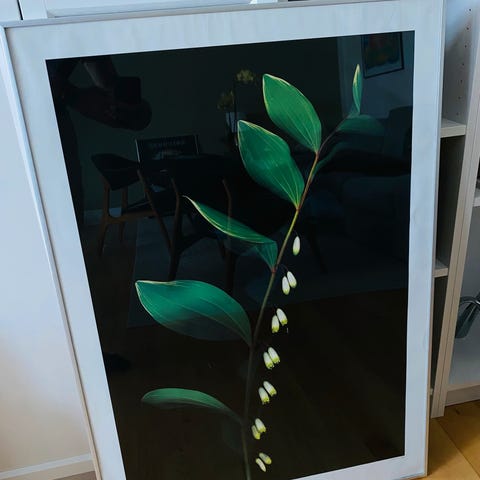 Plakaten er indrammet i en enkel og tidløs lys træramme med hvid passepartout