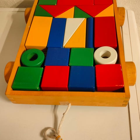 LEGETØJ: Trækvogn med træ klodser