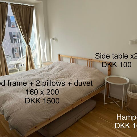 Pæn og ren sengeramme. 140x200. Prisen inkluderer alt - sengeramme, madras, memory foam-puder, dyne. Vi lægger linned i gratis.