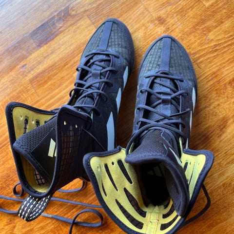 Brugt 1-2 gange. Fremstår som helt nye. Nike Machomai bokse støvler i sort. Høj skaftmodel med snørelukning og flad, mønstret ydersål, der giver godt fodfæste på underlaget. Overdel i syntetisk materiale og tekstil. Velegnet til boksning og lignende indendørs kampsportstræning. Størrelse fremgår af mærkaten som 9 US.