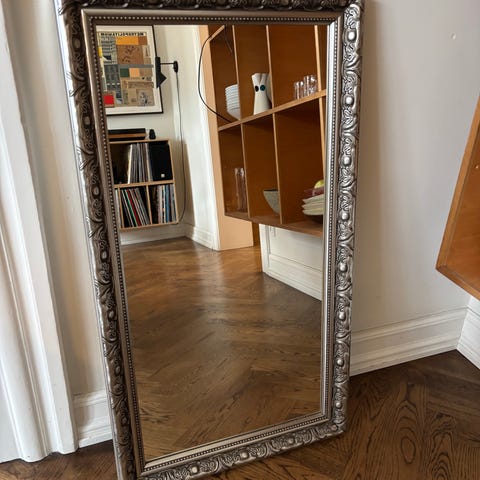 Rammen har fine ornamenterede detaljer og et klassisk udtryk, som passer perfekt i entré, stue, soveværelse eller badeværelse. Spejlet giver både lys og dybde til rummet.