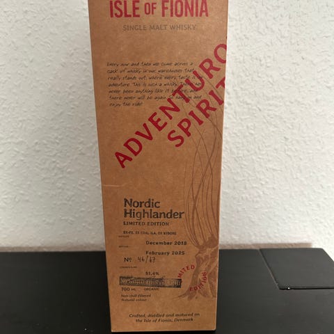 Isle of Fionia Stilhed i Stormen 10 års single malt whisky. Flasken er en 10 år gammel single malt med original æske. Etiketten angiver batch- og flaskenummer samt information om lagring og aftapning. Velegnet som samlerobjekt eller til servering ved særlige lejligheder. Flasken er signeret af materblender Nicolai Rømer