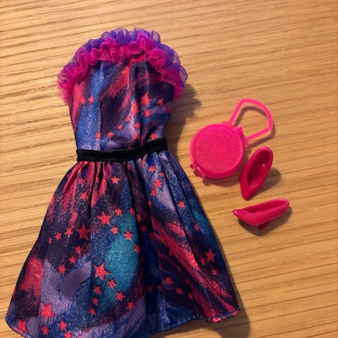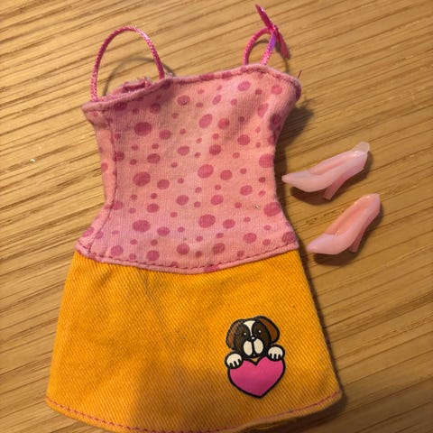 Barbie kjole med sko i blå stof med små prikker og blomster. Kjolen er ærmeløs med stropper og har blondekant forneden. Der medfølger et par hvide højhælede sko, der passer til Barbie-dukker i standardstørrelse. Sættet er egnet som ekstra tøj til leg med Barbie-dukker. Outfit nr #1895