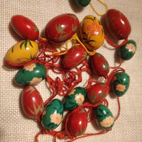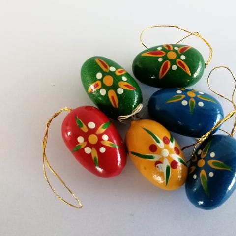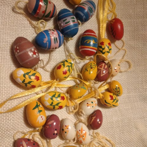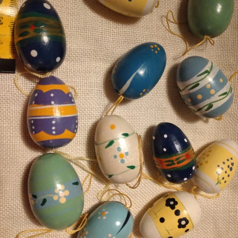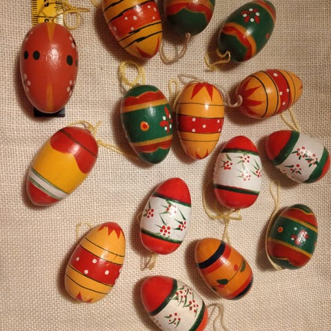 Samling af skønt pynt til påsken 25 æg Ca. 3,5 cm. I længden og 2 klokker Ca. 3 cm. I længden. Sælges samlet.