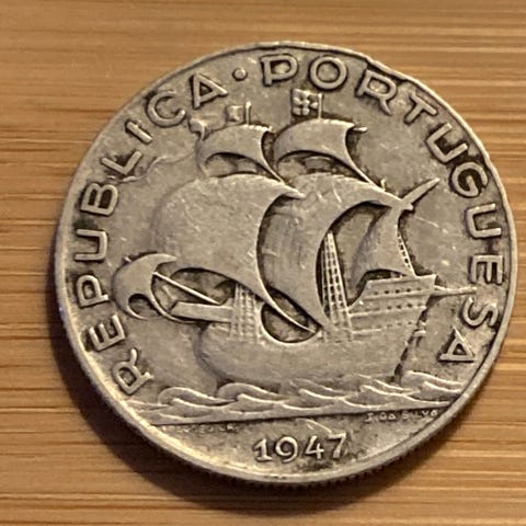 Sølv mønt med Cristobal Colon motiv. Mønten er fra Spanien og har en værdi af 10 Euro