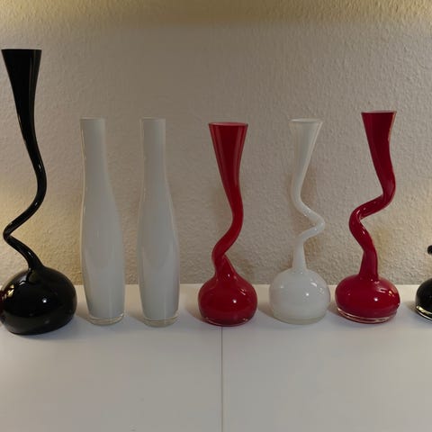 Normann Copenhagen dekorations vaser i sort glas. Sættet består af to skulpturelle vaser med organiske, snoede former og rund fod. Egnede som dekoration på hylde, reol eller bord i stue, entré eller andre rum, hvor der ønskes et enkelt og grafisk udtryk.