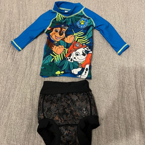 Badetøj str. 2 år. 2 stk. UV dragter fra Soft Gallery og 1 stk. Blebade buks fra Wheat. Størrelse: 2 år. Ny pris samlet 800 kr. Fra hjem uden dyr og røg. Vasket uden parfume mv.