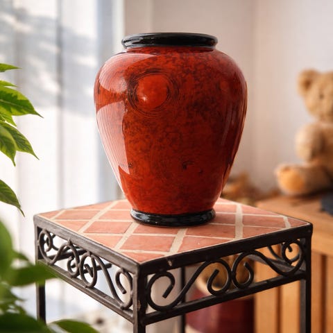 Eurceram keramikvase med reliefdekoration af druer og blade. Vasen er glaseret i lyse og varme nuancer og står på små fødder. Egnet som dekorativ genstand i stue, entré eller spisestue, enten alene eller som beholder til tørrede blomster eller grene.