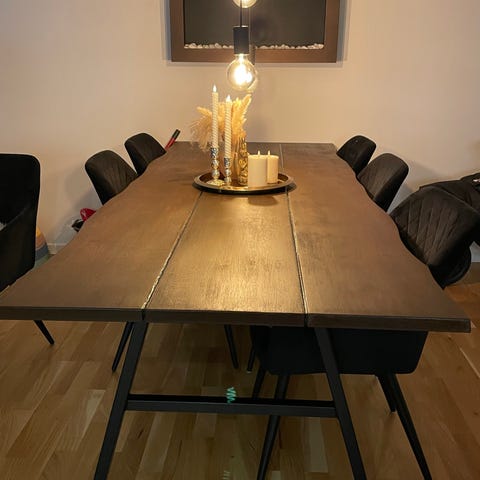 Super flot og velholdt Ilva spisebord bestående af to massive planker i røget eg og skrå ben i sort pulverlakeret metal. Med de 240 cm kan der sidde op til 8-10 personer om bordet, og der er mulighed for at sætte tillægsplader i begge ender af bordet (kan købes i Ilva.) Det er et utroligt flot bord, som vi kun sælger fordi vi skal flytte. Derfor også den meget lave pris. Nypris i Ilva er 8299,-