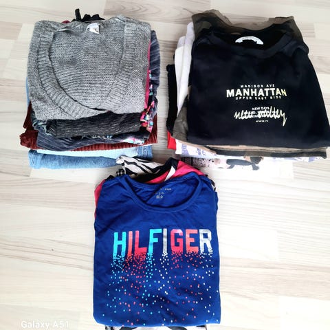 Tøjpakke B – Størrelse 110: 1 stk. vinterjakke fra NameIt, 1 par skibukser fra NameIt, 1 par tynde strikvanter, 1 stk. tyk elefanthue i fleece fra Ver de Terre, 2 stk. tynde elefanthuer, 1 par røde luffer, 9 par sokker, 1 stk. fleecetrøje, 1 stk. tyk halsedisse, 1 stk. Spider-Man kasket, 1 sæt kortærmet sommernattøj, 2 sæt almindeligt (langærmet) nattøj, 1 stk. hvid skjorte, 5 par lange bukser, 6 par shorts, 6 stk. undertrøjer, 11 par underbukser, 6 stk. sweatshirts, 5 stk. t-shirts, 6 stk. langærmede t-shirts. Brugt men ok stand. Vasket uden parfume. Fra hjem uden dyr og røg. Sælges kun samlet.