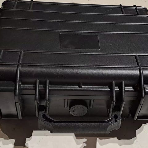 Hård plast transportkuffert i sort. Robust kuffert med kraftigt håndtag og låseanordninger, velegnet til opbevaring og transport af måleudstyr eller andet følsomt værktøj.