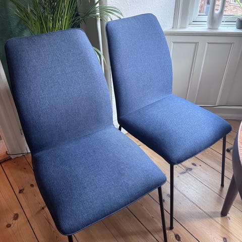 De er behagelige at sidde i med god rygstøtte, og stoffet er i pæn stand med almindelige brugsspor. Ingen løse ben eller skader.