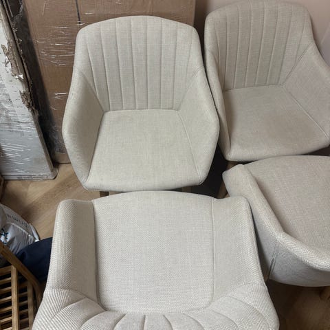 Sælger 4 flotte og komfortable spisestole i lyst stof med træben. Stolene har et moderne og stilrent design, der passer godt til de fleste spiseborde og indretninger.