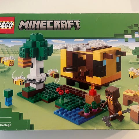 LEGO Minecraft sæt med bi-tema. Sættet indeholder en bi-bikube, et træ, små bi-figurer samt Minecraft-minifigurer og tilbehør. Der medfølger trykt byggevejledning som vist på billedet.