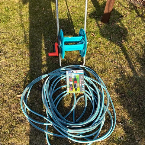 Gardena slangevogn med monteret haveslange. Slangevognen har håndsving til oprulning og metalbøjle som stel. Haveslangen er orange og tilsluttet med standard Gardena-koblinger. Velegnet til vanding i have eller på terrasse, hvor slangen kan rulles op og opbevares på vognen.