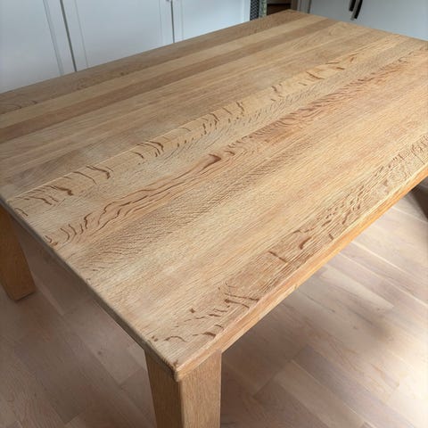 Bordet er stabilt og funktionelt med almindelige brugsspor på bordpladen.