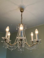 Lysekrone, 6armet lysekrone i veneziansk stil. Ca 40cm høj, kædeophæng 30cm= ca 70cm ialt.