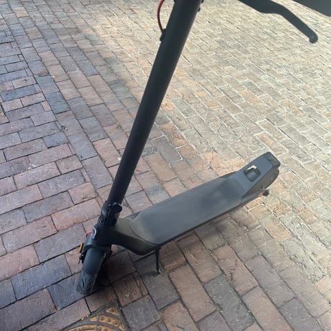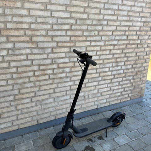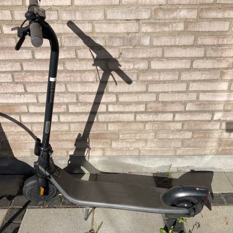 Elektrisk løbehjul i sort. Modellen har ståbræt, styr med håndtag og forhjul med integreret motor. E-løbehjulet er velegnet til kortere ture og daglig transport på jævnt underlag. Sælges uden yderligere angivne specifikationer som rækkevidde, motorstørrelse eller batterikapacitet. Håndtaget på venstre side er rådet af så jeg har bare limede det på kan også svejses oplader medfølger og pris 750 mindste pris 500