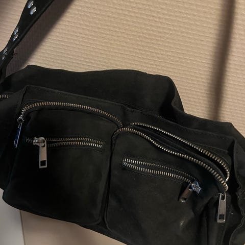 Noella skuldertaske i ruskind. Tasken har justerbar skulderrem og flere lynlåslommer på fronten samt et hovedrum med lynlåslukning. Indvendigt er der foret med tekstil og en mindre lynlåslomme til småting.