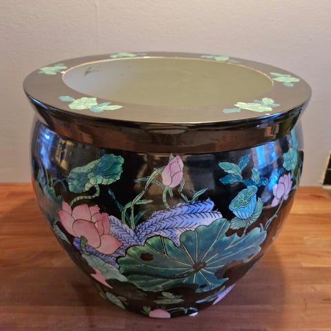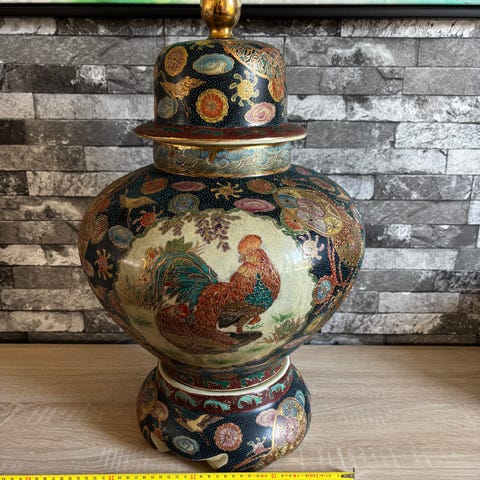 Smuk og dekorativ orientalsk lockurna (krukke med låg) i porcelæn. Krukken er rigt dekoreret med håndmalede motiver af grønne Bok Choy-blade (kinesisk kål) og farverige sommerfugle. Denne stil kaldes ofte for Famille Verte på grund af de dominerende grønne emaljefarver. Krukken har rund form og et tilspidset greb på låget. Højden er ca. 24 cm inkl. låg og diameter 18cm, målt med tommestok på billedet. Egnet som dekorativ opbevaringskrukke eller som pyntegenstand i hjemmet.