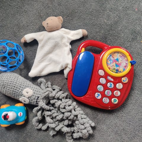 Blandede babylegetøj fra bl.a. søstrene grene. Bideringe til køl og forskellige bamser.