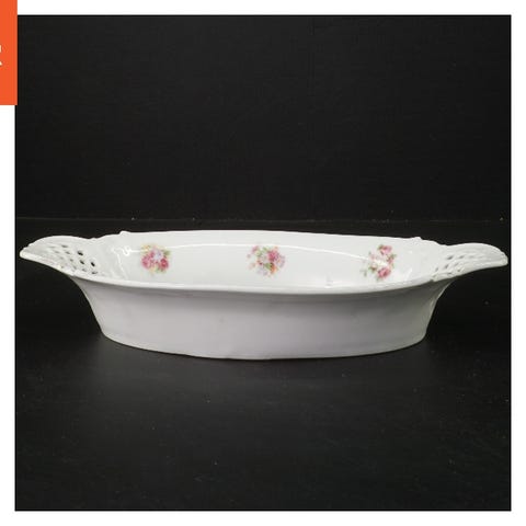 Den har et blomstermotiv i midten med en farverig sammensætning af blomster. Skålen er 14 cm i længden og passer perfekt som dekoration eller til servering af små snacks som småkager og konfekt.