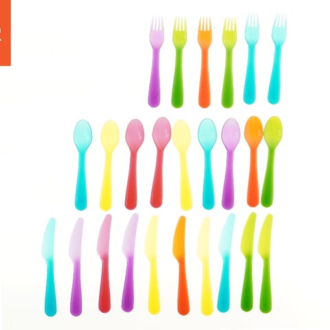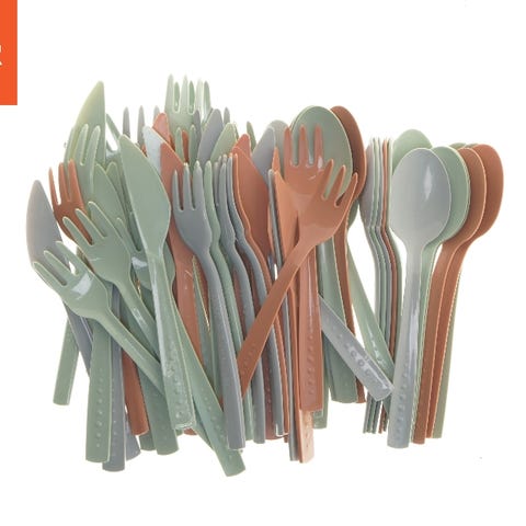 Dette er et bestiksæt og porcelænsæt præsenteret i en gaveæske fra Magppie. Gaveæsken indeholder fire gafler, fire knive og fire skeer lavet af metal. Ved siden af bestikket er der fire porcelænsskåle. Alt er pakket i emballage, der beskytter indholdet og præsenterer det attraktivt.
