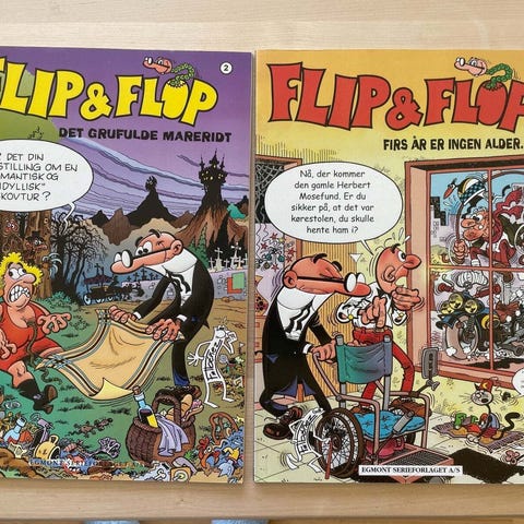 Sammendrag: Indeholder historier med Flip & Flop figurerne, inklusive titler som 'Den sande historie', 'Flippede dyr', og 'F&F i Tirania'.
