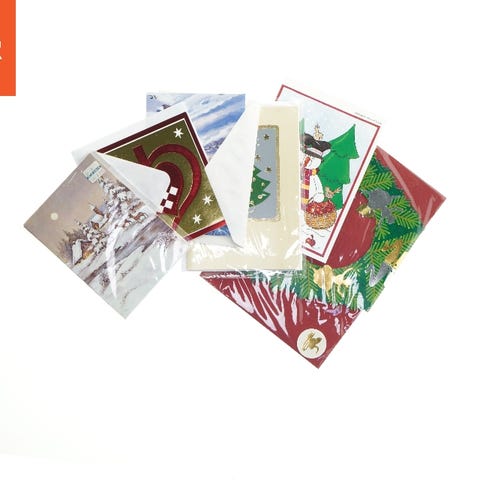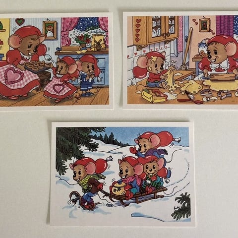Sæt af seks postkort med juletema, hver med en unik illustration på forsiden. Hvert kort kommer med en hvid kuvert. Bagsiden af postkortene er tom, lige til at skrive din egen besked. Der kan ses tekst logoer 'Tivoli' og 'Tuborg', men ikke yderligere information om sammensætning eller materialer.