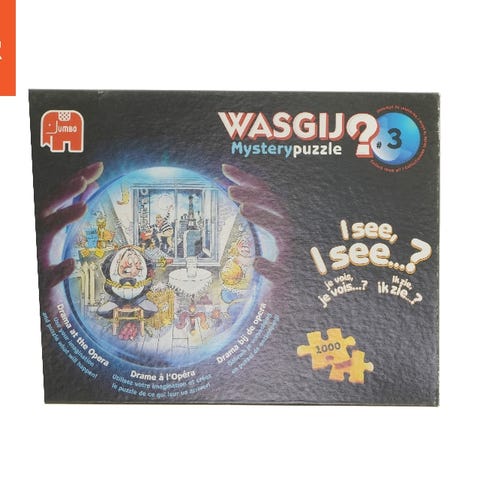 Denne genstand er et puslespil fra mærket Wasgij, ORIGINAL model nr. 13, med titlen 'I see, I see'. Puslespillets tema viser en farverig scene med forskellige karakterer og omgivelser, typisk for Wasgij's unikke stil. Puslespillet indeholder 1000 brikker og kommer i en solid papkasse. Puslespillets motiv er afbildet på forsiden og bagsiden af pakken.
