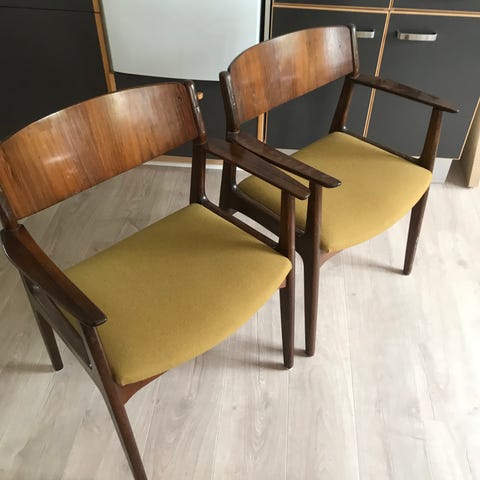 Der er almindelige får brugsspor efter alderen af træværket. Polstringen er pæn og brugbar, men kan også skiftes – der medfølger ekstra stof i samme farve, hvis man ønsker det.
