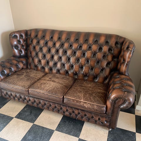 Klassisk 3-sæders Chesterfield-inspireret sofa – Oxbrun læder og dyb knapning