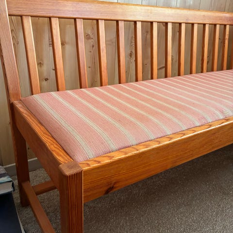 Sofaen har forskellige farver, anbragt i lodrette linjer.