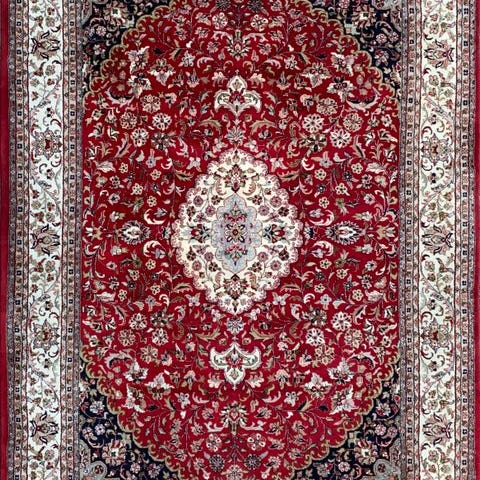 Oprindelse: Indien; Model: Tabriz; 100% håndknyttet tæppe af uld på bomuld, 300 × 255 cm, knudetal ca. 160.000, fremstillet i slutningen af 1980’erne, i god generel stand. Klik på den blå "gå til varen" knap, for at købe eller byde på denne vare. Den samlede pris vil blive vist inden du afgiver dit bud.