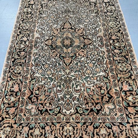Indisk håndknyttet tæppe i silke på bomuld, midten af 1900-tallet, ca. 275 × 190 cm, farverne sort, hvid og brunt, vægt 15 kg, med alders- og brugsspor. Klik på den blå "gå til varen" knap, for at købe eller byde på denne vare. Den samlede pris vil blive vist inden du afgiver dit bud.