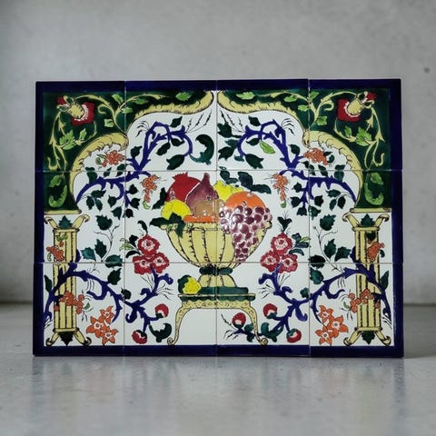 Smukt vægpanel bestående af 12 keramiske fliser, der danner en elegant dekorativ scene inspireret af middelhavsstil.