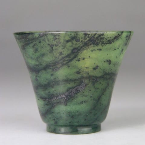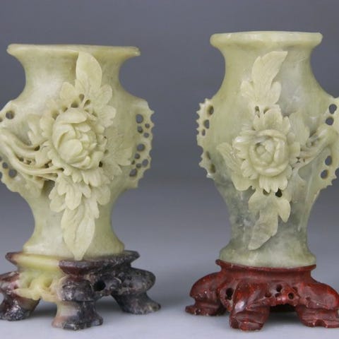 Original vase-skulptur af serpentinsten fra Kina, begyndelsen af det 20. århundrede, med titel 'Vase Sculpture - Rose - Socle en Bois de Rose', med rosewood-bund, i fremragende stand; højde 19 cm med fod, 16,5 cm uden, vægt 385 g. Klik på den blå "gå til varen" knap, for at købe eller byde på denne vare. Den samlede pris vil blive vist inden du afgiver dit bud.