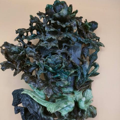 Vase-skulptur - Rose - Fod af rosentræ - Sten, Serpentin udskåret - Kina - Be...