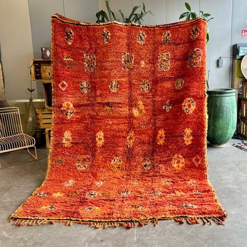 Oprindelse: Marokko; Model: Vintage Moroccan Boujad Rug – Handwoven Berber Wool; Mål 180 × 280 cm; Farve: Orange; Materiale: 100% uld; Tilstand: i meget god stand; Professionelt renset. Klik på den blå "gå til varen" knap, for at købe eller byde på denne vare. Den samlede pris vil blive vist inden du afgiver dit bud.