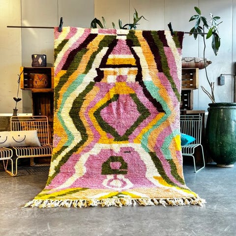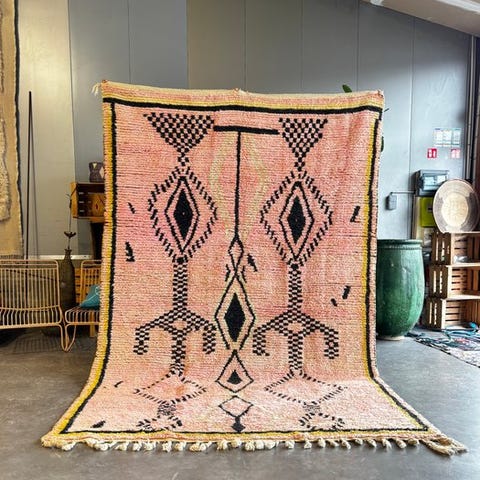 Denne autentiske vintage-morokkanske Boujad-tæppe er et smukt eksempel på traditionelt berberhåndværk, håndvævet i Marokko med naturlig uld. Boujad-tæpper værdsættes for deres udtryksfulde geometriske mønstre, jordnære farvepaletter og stærke kunstneriske identitet, hvilket gør hvert stykke helt unikt.