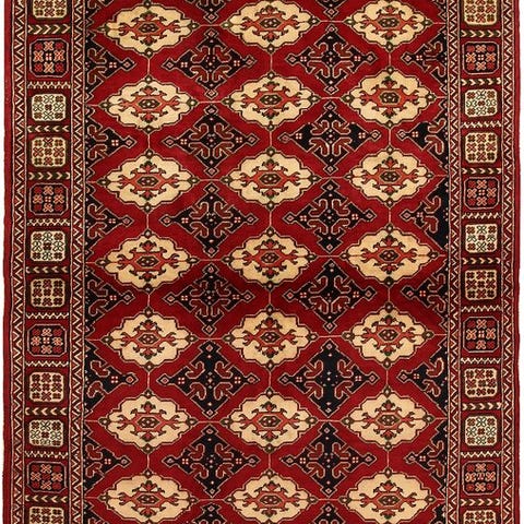 Smukt tæppe i orientalsk stil med geometriske motiver af traditionel Bokhara-typen. Baggrund i beige/creme prydet med gentagne røde medaillons, indrammet af en rig kant i nuancerne bordeaux, sort og beige.