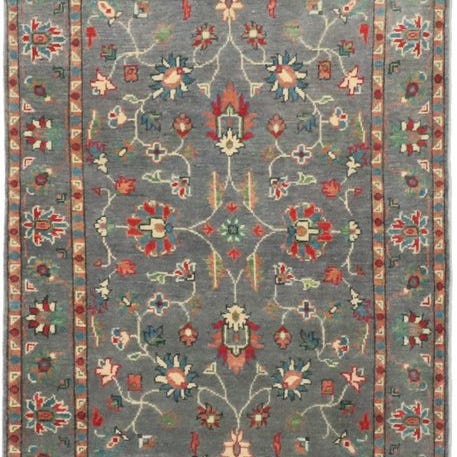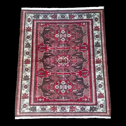 Kazak-tæppet er håndknuddet i Afghanistan, og designet er inspireret af russiske og kaukasiske geometriske mønstre.