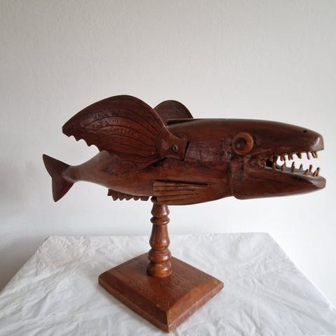 Træfiskestav fra Påskeøen, tituleret Club, fra midten af det 20. århundrede, udskåret med Birdman-glyfer og øjne inlagt af knogler og obsidian, ca. 38 cm lang og 8 cm bred, i god stand med mindre slitage, oprindelse Ex Private UK Collection. Klik på den blå "gå til varen" knap, for at købe eller byde på denne vare. Den samlede pris vil blive vist inden du afgiver dit bud.