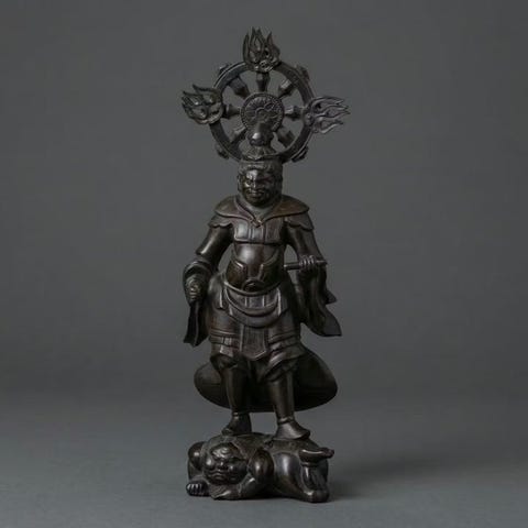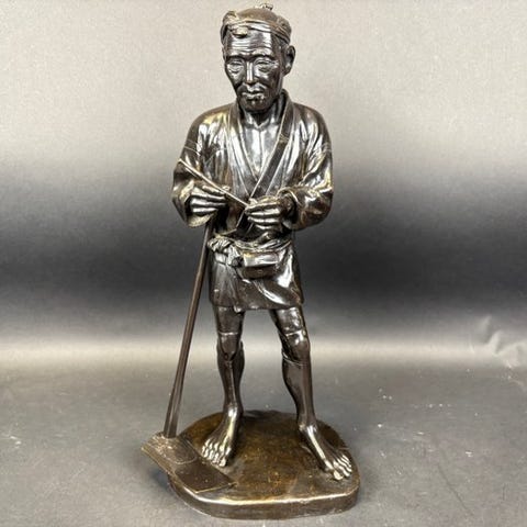 En bronzestatue fra Meiji-perioden med titlen 'A lifelike bronze bison', signeret 'Toku Atsuyoshi saku Maruki sha sei', fra Japan, 14 cm høj, 25 cm bred og 7 cm dyb, i god stand med en brud i halen. Klik på den blå "gå til varen" knap, for at købe eller byde på denne vare. Den samlede pris vil blive vist inden du afgiver dit bud.
