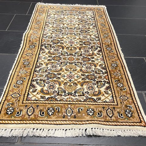 Oprindelsesland: Indien; håndvævede Orientteppet Isfahan, uld på bomuldsgulvet, 240 × 140 cm, i god stand med alders- og brugsspor. Klik på den blå "gå til varen" knap, for at købe eller byde på denne vare. Den samlede pris vil blive vist inden du afgiver dit bud.
