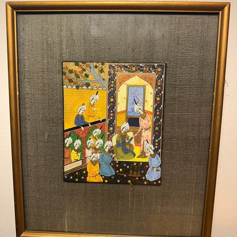 Ældre kinesisk håndlavet miniature udført af naturmaterialer; indrammet bag glas. Fin stand.