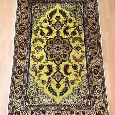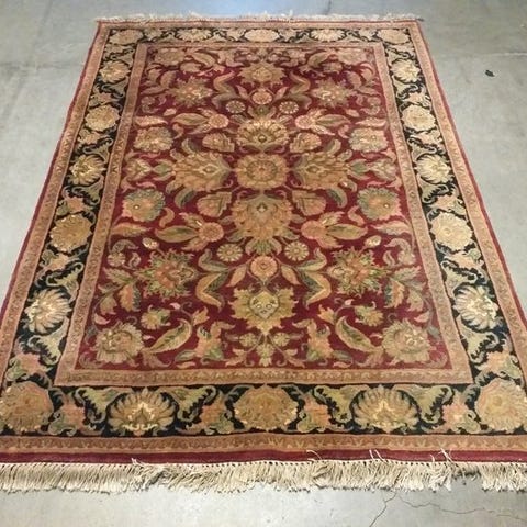 Det har et rigt dekoreret mønster med et stort centralt medaillon og elegante blomstmønstre, inspireret af traditionelle persiske tæpper.